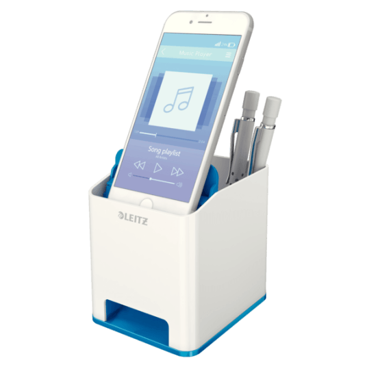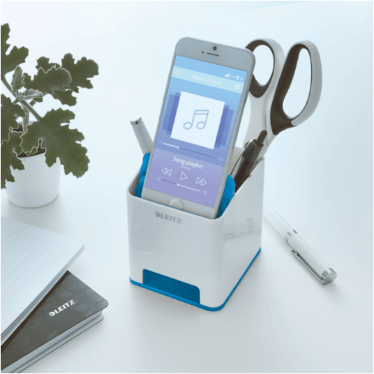 Praktyczny i stylowy kubek na długopisy, wykończenie z połyskiem oraz unikalne zestawienie dwóch kolorów gwarantują przykucie wzroku. Dodatkowo posiada przegródkę na smartfona, podgłaśniającą dźwięk by umilić pracę w biurze czy w domu.