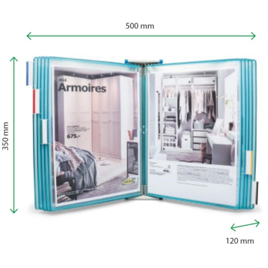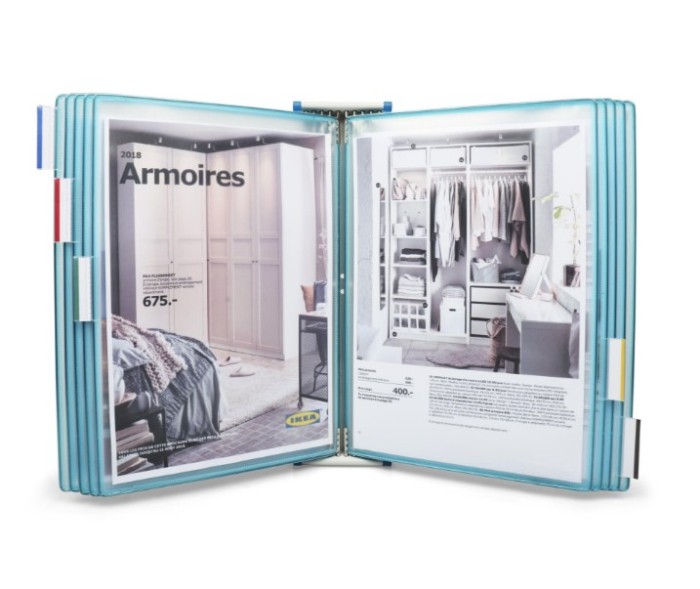 - system składa się z 10 obrotowych paneli prezentacyjnych w danym kolorze, 5 zakładek indeksujących oraz materiałów montażowych