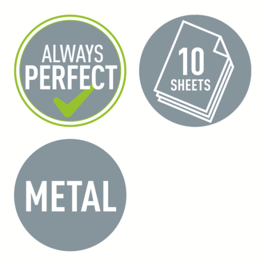- Wyraźne oznaczenia formatu i wytrzymała prowadnica zapewniają perfekcyjne wyrównanie papieru