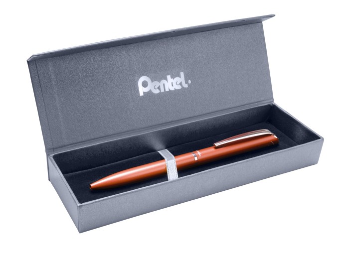 Długopis żelowy PENTEL STERLING cechuje się wyjątkowym stylem w nowoczesnym wydaniu. Jego obudowa została pokryta lakierem o chropowatej powierzchni, dzięki któremu długopis jest wygodny w użytku. Zastosowany żelowy tusz zapewnia błyskawiczne wysychanie i wyrazistą linię, a pisanie jest gładkie i przyjemne. Każde pióro jest zapakowane w eleganckim etui, dzięki czemu idealnie nadaje się na prezent.