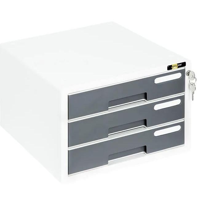 Plastikowa szafka na dokumenty zamykana na klucz z 3 szufladami . Każda z szuflad zawiera okienko opisowe.