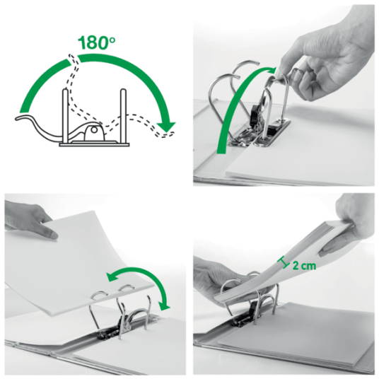 - Opatentowany mechanizm 180° umożliwia o 50% szersze otwarcie i o 20% szybsze segregowanie dokumentów