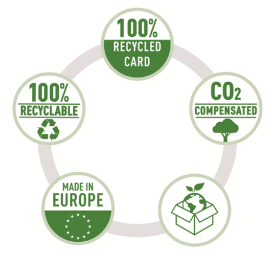 - Neutralny dla klimatu, karton w 100% pochodzący z odzysku i w 100% nadający się do recyklingu, z certyfikatami środowiskowymi Blue Angel i FSC