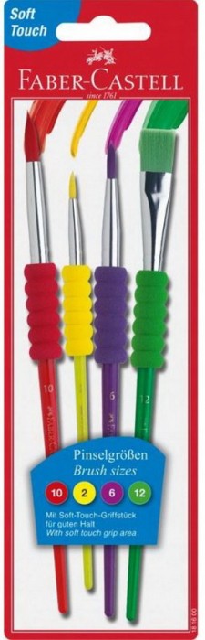 Zestaw pędzelków dla dzieci Faber-Castell z miękkim uchwytem w 4 rozmiarach i kolorach w opakowaniu blistrowym. Idealne zarówno do szkoły jak i podczas zabaw w domu. Stworzone dla nieograniczonych możliwości malowania na papierze i innych powierzchniach. Doskonałe zarówno do malowania detali jak i pokrywania większych powierzchni. Z wysokiej jakości miękkim włosiem syntetycznym i unikalną, miękką, antypoślizgową strefą uchwytu. Zestaw dostępny również w wersji pastelowej.