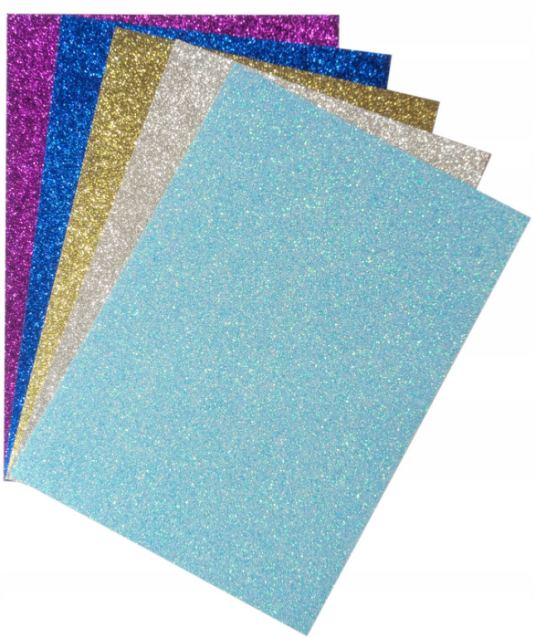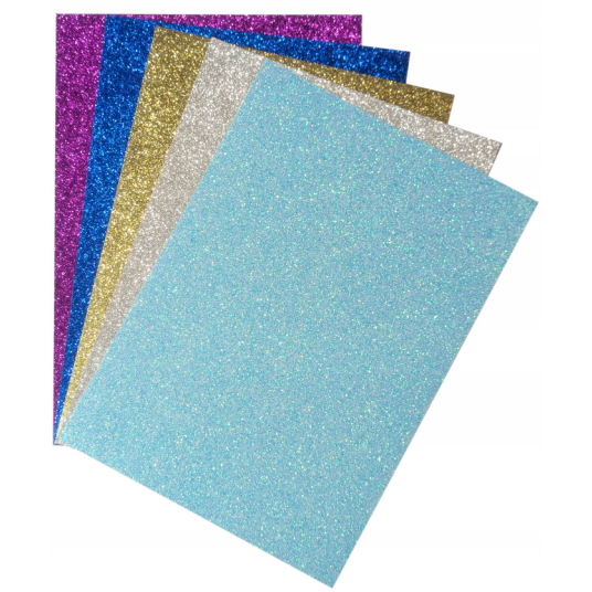 Zestaw 5 arkuszy w formacie A4 w intensywnych kolorach o fakturze chropowatej z brokatowym wykończeniem. Przeznaczone do zdobienia zaproszeń, kartek okolicznościowych, pudełek.
