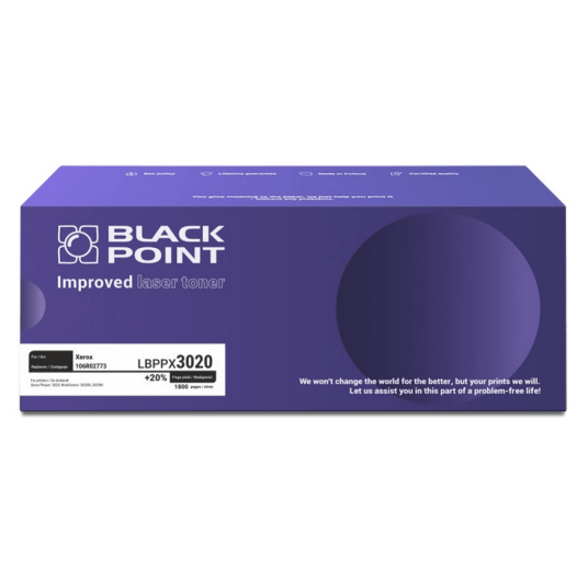 Toner Black Point LBPPX3020 został zaprojektowany jako pełnowartościowa alternatywa dla oryginalnego wkładu Xerox. Zapewnia wysoką jakość druku, niezawodność oraz realne oszczędności dzięki zwiększonej wydajności. Doskonale sprawdzi się przy codziennym drukowaniu dokumentów tekstowych, raportów czy korespondencji.