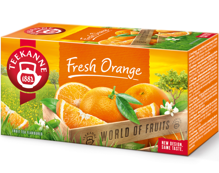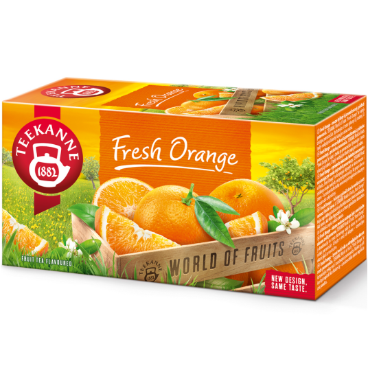 Teekanne World of Fruits "Fresh Orange" to pyszna herbata owocowa, łącząca naturalne składniki z intensywnym smakiem świeżych pomarańczy. Idealna do picia na gorąco i na zimno – dla całej rodziny.